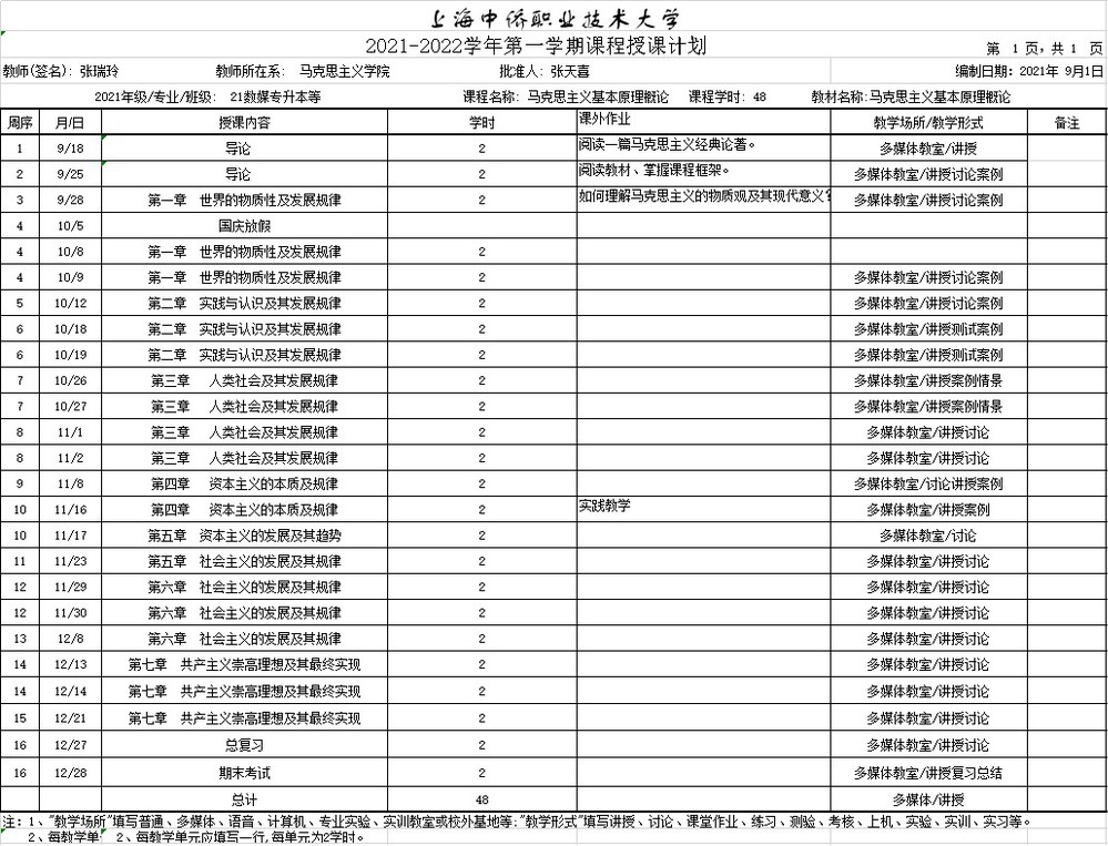 2021-2022学年第一学期《马克思主义基本原理概论》授课计划