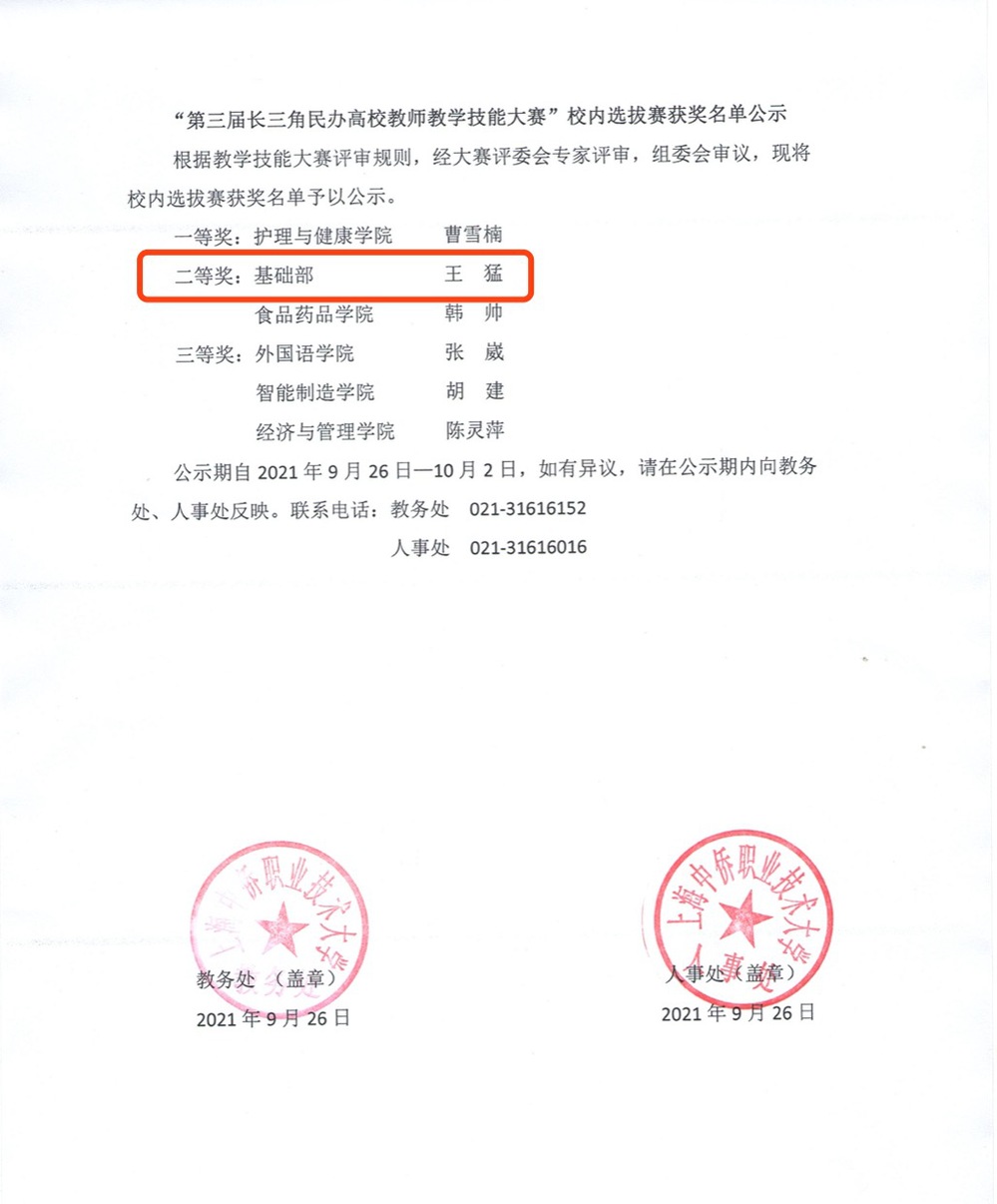 | 我院王猛老师荣获第三届长三角民办高校教师教学技能大赛校内选拔赛二等奖 |