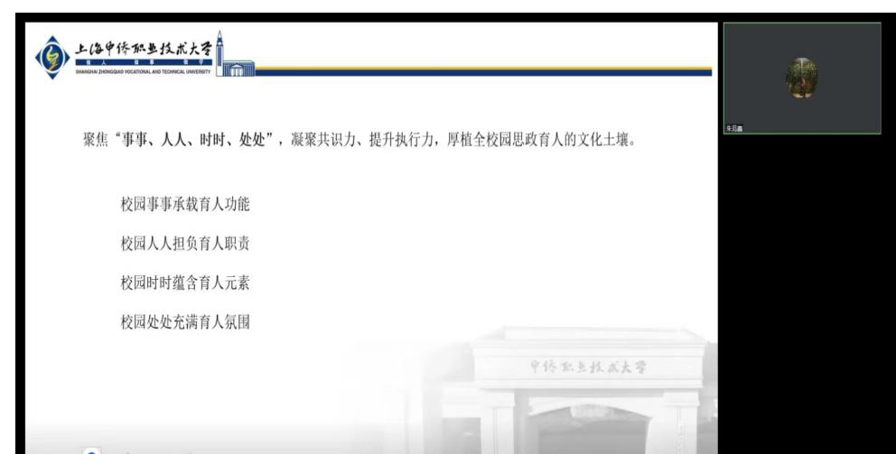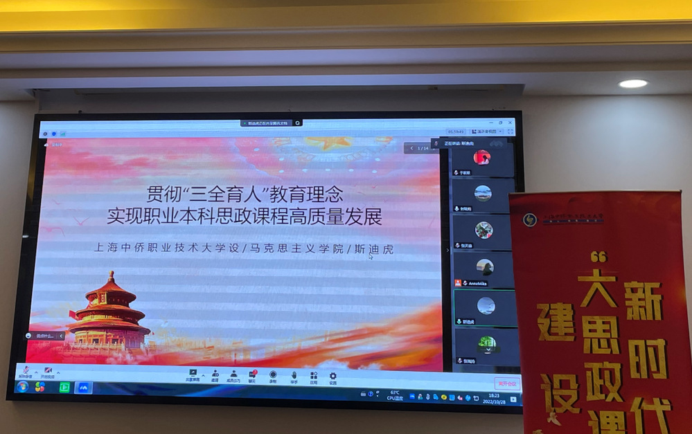 为推动党的二十大精神进思政课堂,深入贯彻落实习近平总书记关于“大思政课”的重要指示批示,2022年10月28日,上海中侨职业技术大学马克思主义学院以线上线下相结合的方式,组织召开新时代“大思政课”建设专题研讨会。校党委书记平杰教授、副书记管琰琰教授、书记助理、校团委书记朱范鑫,艺术学院副院长窦蓉蓉、马克思主义学院常务副院长张天喜、党支部书记封晓莉、建筑工程学院党支部副书记岳建梅、重大项目管理办公室陶秋意、其他学院教师代表及全体思政教师参会。研讨会由封晓莉老师主持。