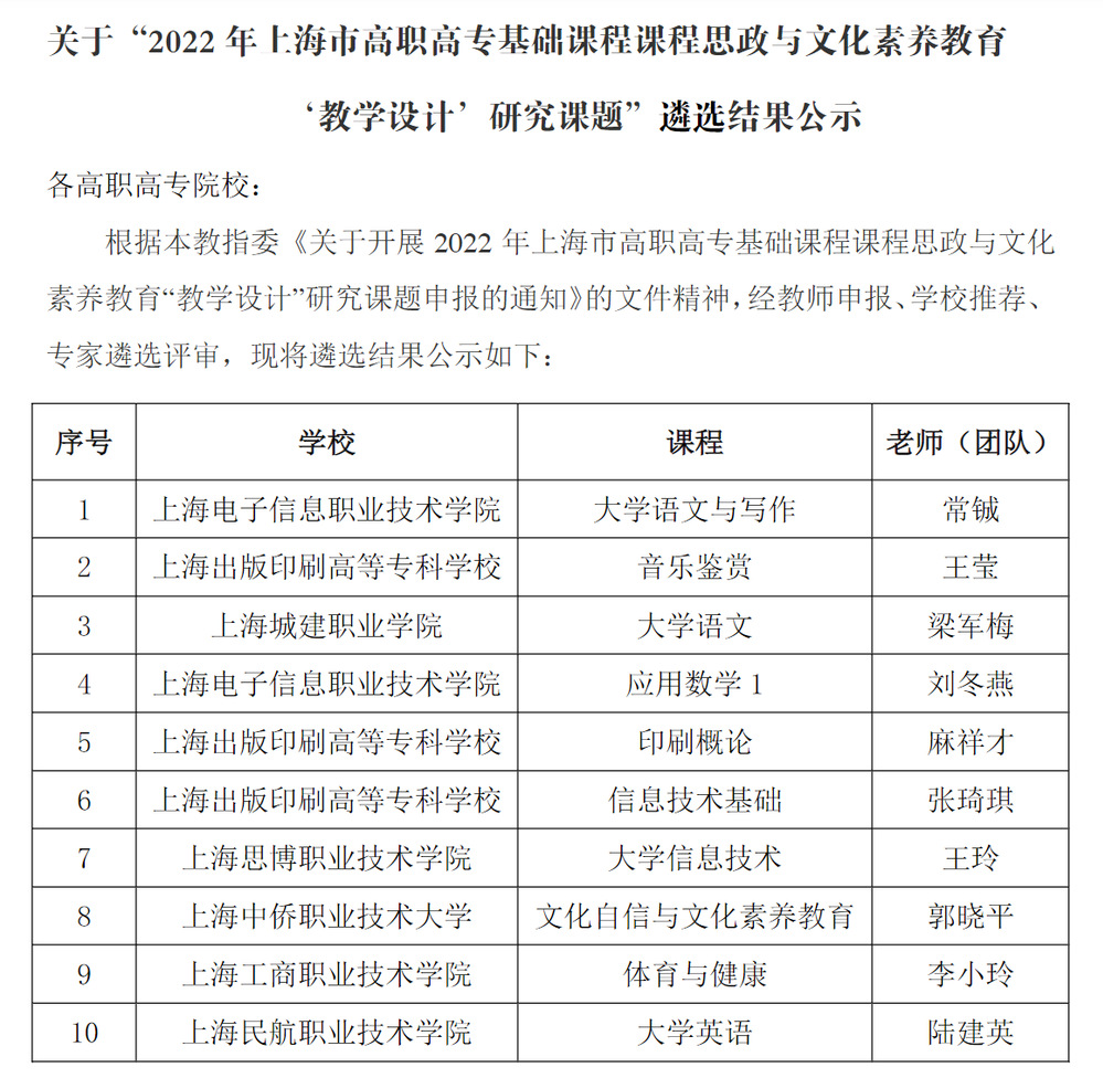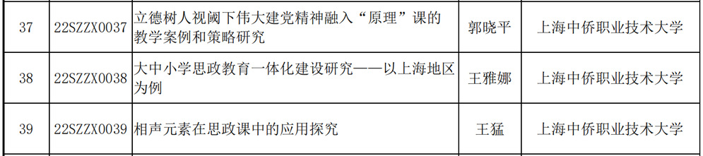 另外,根据2022年度上海市高职高专思想政治教育专项课题立项的通知,马克思主义学院王雅娜、王猛和郭晓平三位老师的项目获得立项。