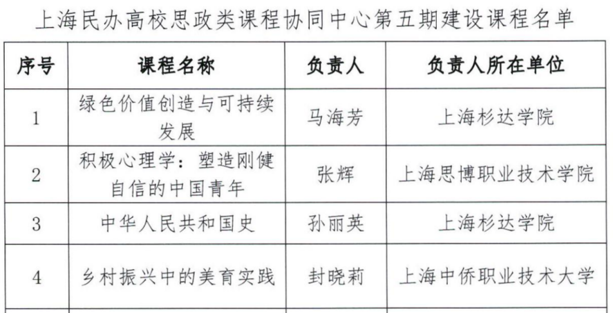 学院选修课《文化自信和文化素养教育》获得2022年上海市高职高专基础课程课程思政与文化素养教育‘教学设计’研究课题立项。《乡村振兴中的美育实践》获上海民办高校思政类课程协同中心第五期建设课程名单,目前正在建设中。