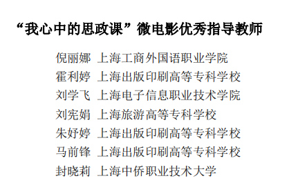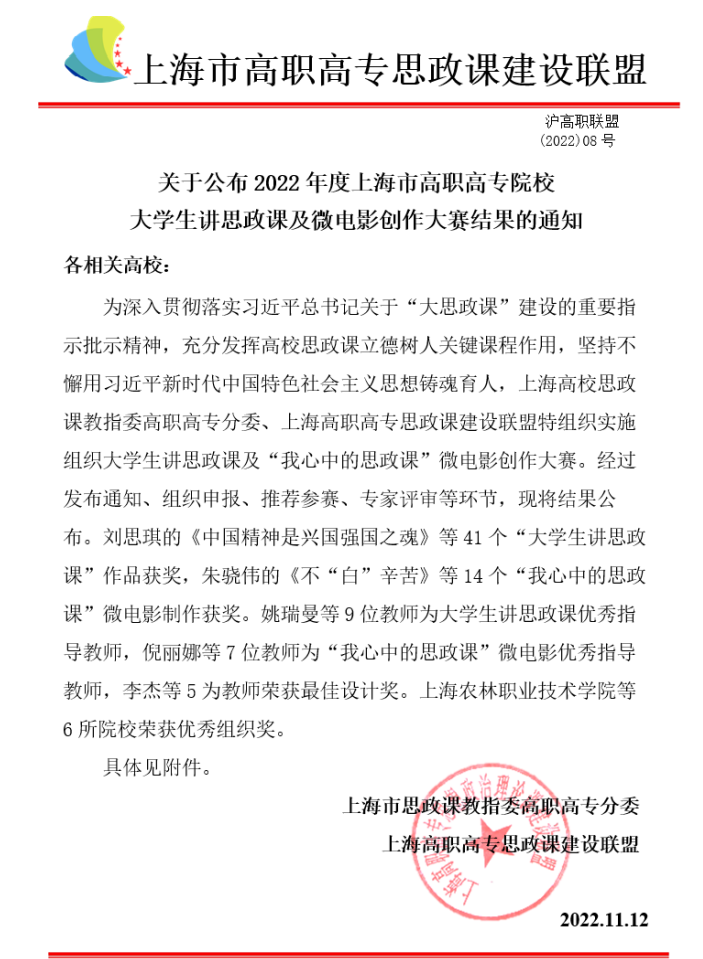 11月12日,2022年度上海市高职高专院校大学生讲思政课及微电影创作大赛结果公布,在马克思主义学院的精心组织下,我校选送作品获一等奖1项,二等奖2项,优秀奖1项,学院党支部书记封晓莉老师获得优秀指导教师。