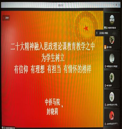 封晓莉副教授作了题为“二十大精神融入思政理论课教育教学之中,为学生树立有信仰有理想有担当有情怀的榜样”的报告。在报告中她提到,思政课教师要贴近学生实际,以润物细无声的方式将二十大精神有机融入到各门思想政治理论课程中去,从而推进二十大精神进学生头脑。她分享了自己在教学过程中一些行之有效的做法,比如利用红色歌曲创设学习情境,激发学生学习理论课的兴趣,利用创编的顺口溜增强学生记忆能力等。最后,她勉励思政课教师要始终秉持一颗对学生的仁爱之心,对教育事业的热爱之情,当好学生的引路人。
