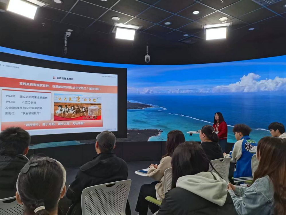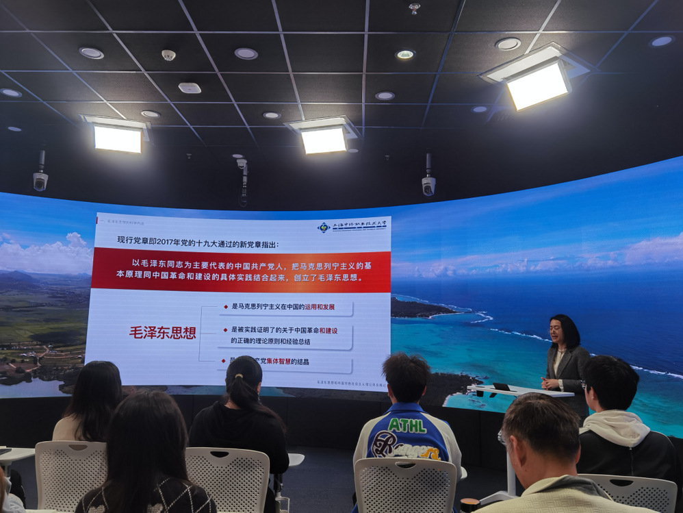 此次示范课在35号楼一楼数字化全景教室进行,采用现代教育理念和教育技术手段,引入空间设计理念,通过灵动式桌椅布局带来空间布局的变化,教学效果显著。 陈艳老师深入挖掘和分析毛泽东思想的科学内涵,让学生对其有一个更深刻的理解和认识。在毛泽东思想的指引下,我们党领导全国人民,找到了一条适合中国国情的正确道路,我们应该珍视在中国革命和建设的过程中,把马克思主义基本原理同中国具体实际相结合、同中华优秀传统文化相结合所形成的这一科学理论成果,并在新的实践中运用和发展。