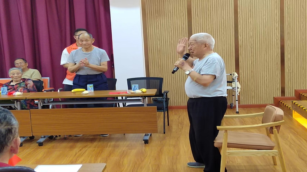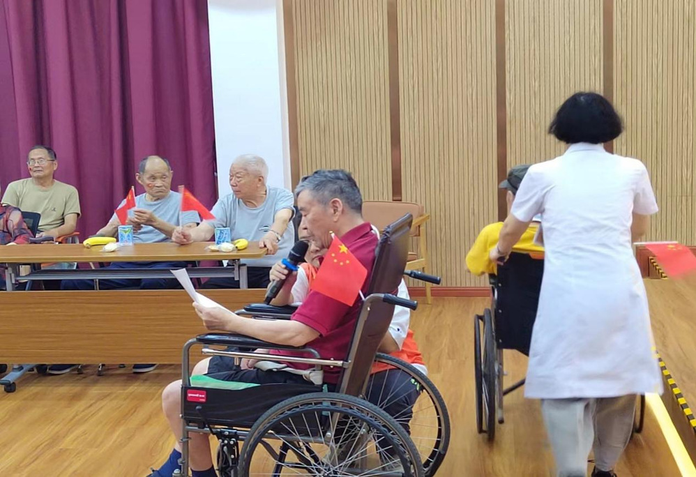 慰问表演:老少同台欢乐多,寄语祝福庆双节 丹桂飘香的敬老院里,节庆氛围浓郁。杨国斌爷爷以一首沪剧《正二三月草青青》,拉开了本次迎中秋、庆国庆活动的帷幕,全场掌声热烈、欢腾不已。周志强爷爷精神抖擞、神情凝华,深情朗诵自己的原创诗歌,带领人们穿越战火纷飞年代,追忆革命先烈,忆苦思甜,感恩祖国强大繁荣,珍惜好时光。