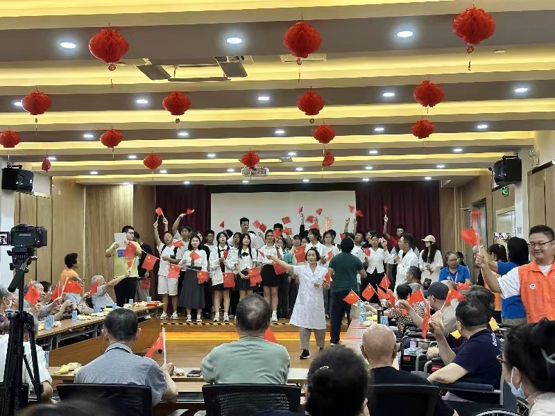 在马院党支部书记封晓莉的组织下,全体师生和养老院全体员工走上舞台中央大合唱一首《歌唱祖国》,活动正式进入尾声。现场红旗飘扬,歌声嘹亮,唱到动情之处“歌唱我们亲爱的祖国,从今走向繁荣富强”很多同学眼里饱含泪水,声音哽咽。