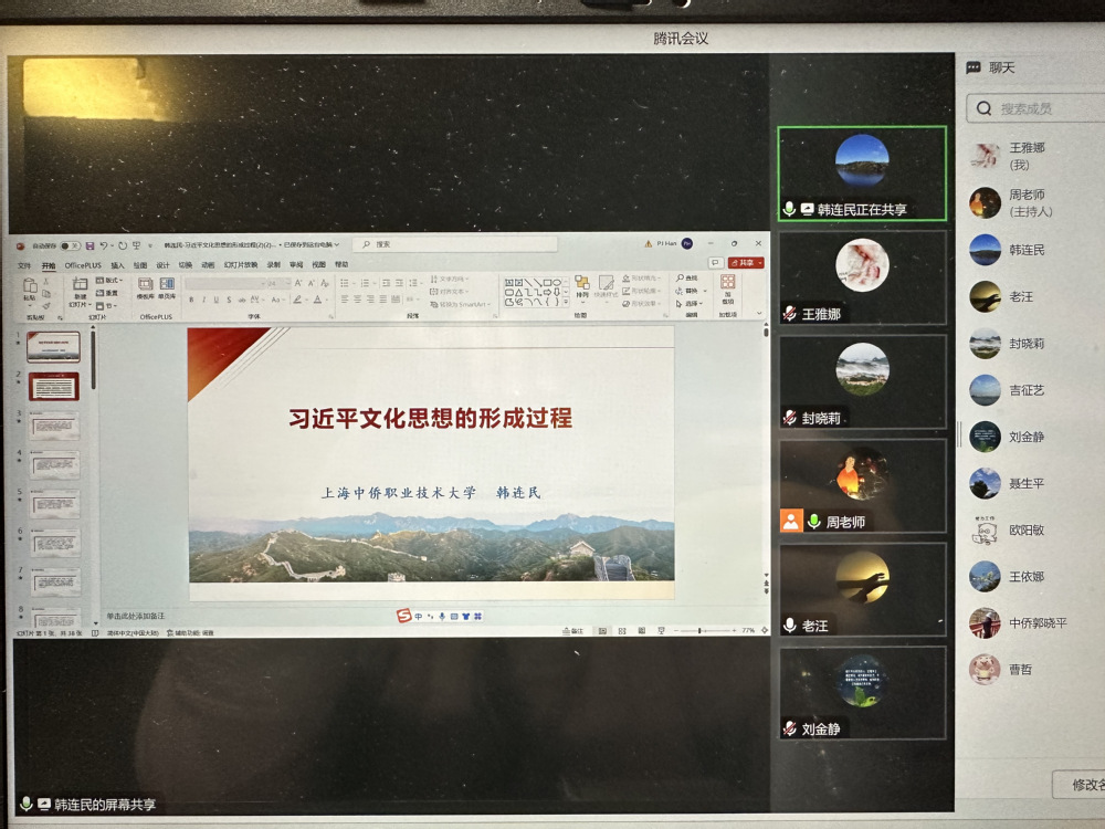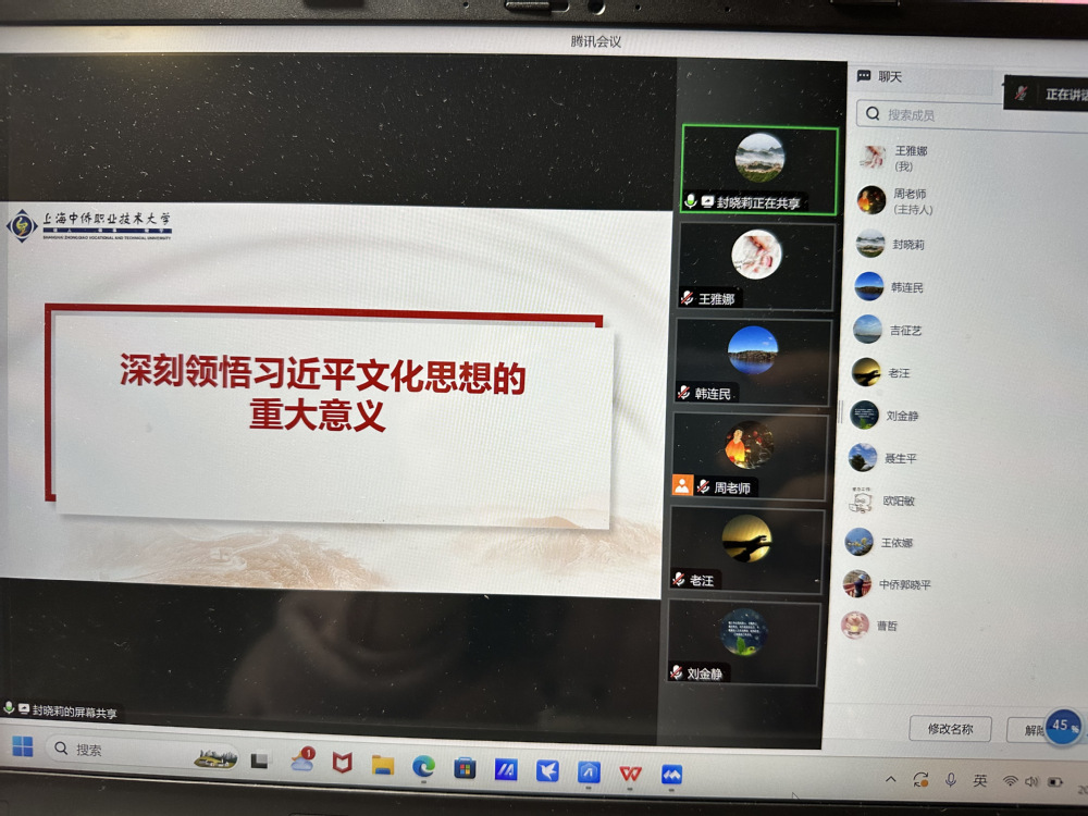 上海中侨职业技术大学马克思主义学院两位老师围绕习近平文化思想进行了交流发言。韩连民老师以习近平文化思想的形成过程为题,结合习近平总书记的工作经历,饱含情感地阐述了习近平文化思想的形成过程。封晓莉老师以深刻领悟习近平文化思想的重大意义为题,重点阐述了新时代思政教师怎样担当文化使命,广大青年学子如何做文化自信的践行者。两位老师的精彩发言为推进习近平文化思想进教材、进课堂、进学生头脑起来了很好的示范引领作用。