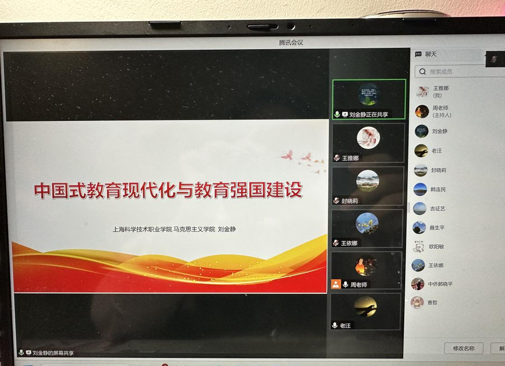 上海科学技术职业学院马克思主义学院两位老师围绕教育强国进行了专题发言。刘金静老师以中国式教育现代化与教育强国建设为题,回顾了中国式教育现代化的发展历程,从六个方面展现了中国式教育现代化的根本遵循,并对推进教育现代化的总体目标进行了精准诠释。汪应明老师以习近平总书记关于教育强国的论述为题,详细梳理了从2012年到2023年习近平总书记关于教育的重要论述。两位老师的精彩发言为我们在展开教育专题教学打开了新思路,提供了新方法。