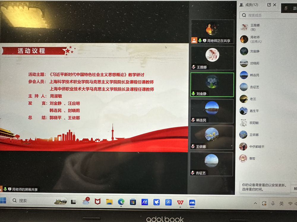 新学期,《习近平新时代中国特色社会主义思想概论》教材全国发行,走进大学课堂。为学好用好新教材,打造春风化雨的思政金课,系统深入推进习近平新时代中国特色社会主义思想“三进”工作,2023年11月12日,上海中侨职业技术大学与上海科学技术职业学院共同举办《习近平新时代中国特色社会主义思想概论》集体备课会。参加本次备课会的有:上海科学技术职业学院马克思主义学院院长王依娜,上海中侨职业技术大学马克思主义学院书记封晓莉、副院长郭晓平,以及两校承担该课程的全体老师。会议由上海中侨职业技术大学《习近平新时代中国特色社会主义思想概论》课教研室主任周淑敏主持。本次备课会围绕着教育强国和习近平文化思想两个专题展开。