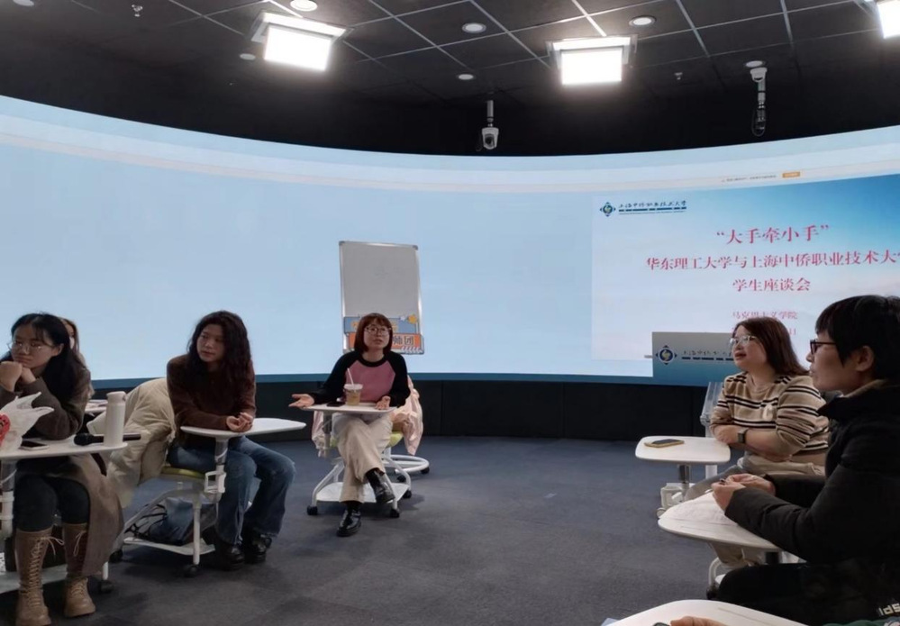 为落实大手牵小手,加强公民办学校之间的交流合作,实现全过程、全方位、全员育人,3月20日中午,我院与华东理工大学马克思主义学院在图书馆1楼全景教室召开了“大手牵小手——华东理工大学与上海中侨职业技术大学学生座谈会”。华东理工大学教师及学生代表、我院青年教师、本科生代表和中侨青年讲师团代表等30余人出席了本次活动。座谈会由马克思主义学院党支部书记封晓莉主持。