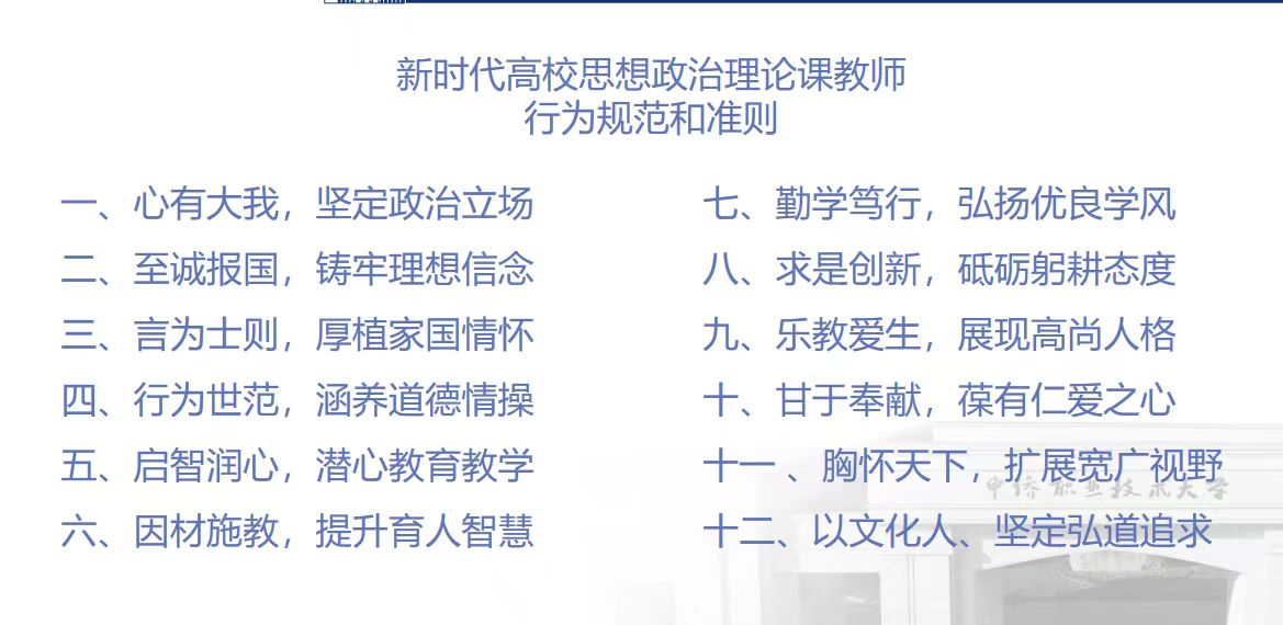 马院肩负着为党育人、为国育才的重要使命,承担着培养担当民族复兴大任的时代新人的重任,马院的所有工作都是育人,马院存在的根本意义就是育人。马院教师的师德师风建设就显得尤为重要,依据《新时代高校思想政治理论课教师行为规范和准则》(以下简称《准则》),马克思主义院党支部书记封晓莉强调,《准则》对思政课教师提出了更高的要求,为思政课教师未来的发展指明了方向,为新时代思政课教师规范自身的言行提供了根本遵循,全体思政课教师要以实际行动践行文件精神,牢记使命担当。通过集体学习,全体思政课教师纷纷表示在自身今后的工作中,将自觉遵守文件精神,潜心教书育人、培根铸魂。