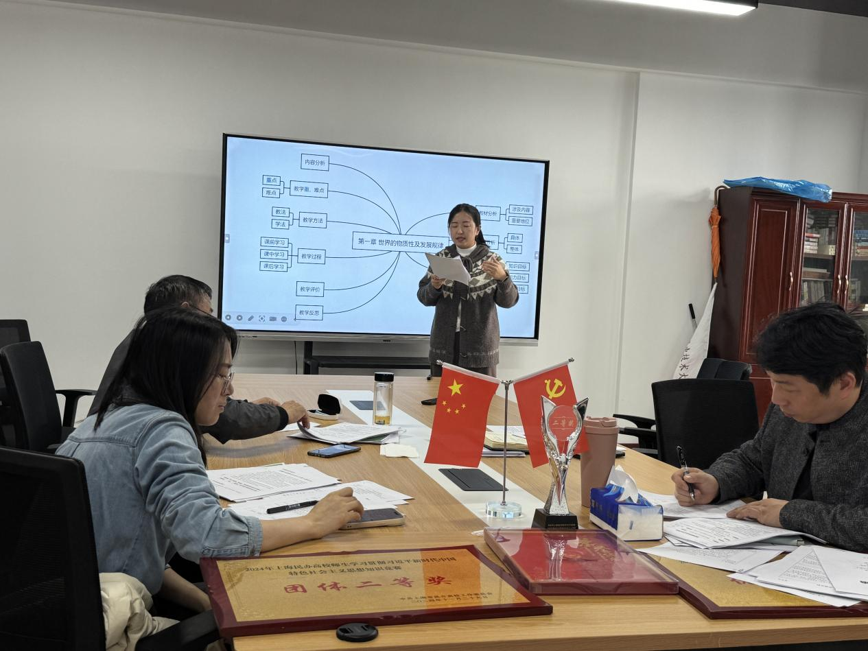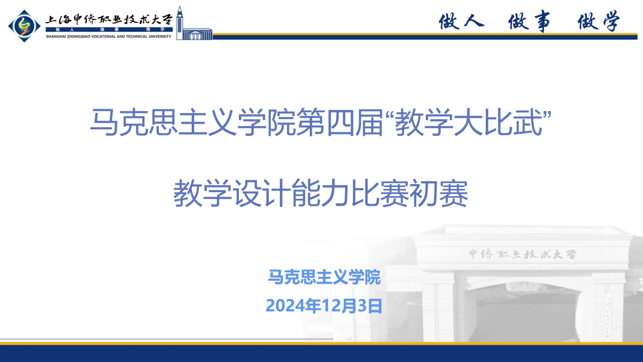 为深入学习贯彻落实习近平总书记对学校思政课建设作出的重要指示和新时代学校思政课建设推进会精神,发挥思政课作为落实立德树人根本任务的关键课程作用,提升青年教师的教学能力,2024年12月3日,上海中侨职业技术大学马克思主义学院开展第四届“教学大比武”教学设计能力比赛初赛,马院13位教师精心准备。活动由马克思主义学院教学副院长郭晓平主持。