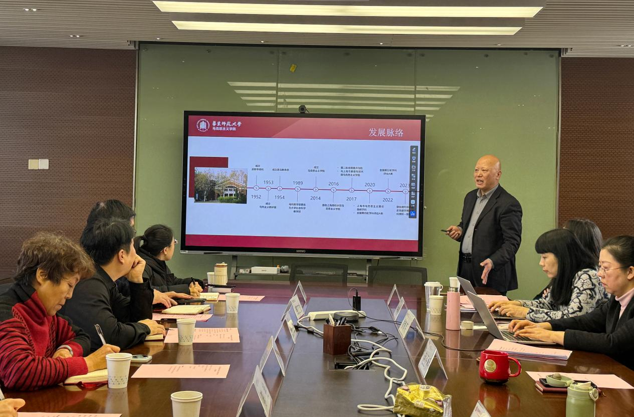 首先,华东师范大学马克思主义学院赵正桥书记对我校马院一行教师的到来表示热烈欢迎。随后,赵书记从华东师范大学马院的发展脉络、学院概况、学院思政课建设、课程建设成果、大中小思政教育一体化建设、科研立项以及学术论文、社会服务等七大方面对华东师范大学马克思主义学院的建设发展经验进行了详细的梳理与总结,为中侨马院建设提供了宝贵的借鉴和启示。我校马院党支部书记封晓莉表示,将认真借鉴华师大马院的成功经验,在学校党委书记平杰的引领下,建设具有职业本科特色的马克思主义学院,并积极探索公办与民办院校联合发展的新路径,为青年教师搭建更广阔的科研平台及职业发展通道,着力培养能够担当时代重任的教师团队。