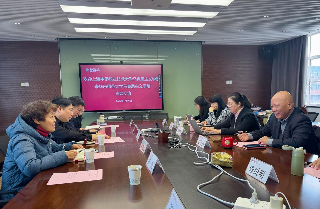 为深入贯彻习近平新时代中国特色社会主义思想,全面落实党的二十大及二十届三中全会精神,进一步提升中侨马院教师队伍建设水平和育人实效,加强院校间的交流与合作。2025年1月16日上午,上海中侨职业技术大学马院党支部书记封晓莉、各教研室主任以及专职教师一行8人赴华东师范大学马克思主义学院开展学习交流,华东师范大学马克思主义学院党委书记赵正桥、党委副书记崔海英以及副院长许瑞芳、速继明、蒲妍出席交流。华东师范大学马克思主义学院党委书记赵正桥老师主持会议。