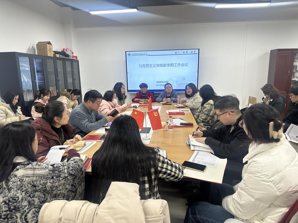 为进一步推动马克思主义学院的教学与科研工作,做好新学期的各项任务安排,2月20日上午,马克思主义学院在图文楼301召开新学期工作会议,马克思主义学院常务副院长张天喜、党支部书记封晓莉、教学副院长郭晓平及全体马院教师参加,会议由张天喜院长主持。 会议伊始,张院长详细讲解了新学期的工作计划。她强调,学院将继续秉持“立德树人”的根本任务,紧紧围绕“打造特色马院”的目标,深入推进攻坚提质工程,加强“大思政课”建设,推动民创项目等重点工作,进一步深化与创新思政课程。同时,张院长对学院的教学、科研、社会实践等方面做了详细部署,并提出了实施细节,通过系统化、规范化的方式推进各项工作,持续提升教学质量和科研水平。 随后,郭院长针对新学期的工作提出了具体要求。她强调备课、查课、试卷自查等教学管理工作是确保教学质量的关键环节,要求全体教师在教学中严格把关,确保每一堂课都能传递出马克思主义的真理力量。郭院长指出,进一步加大建设力度,确保各项任务落到实处,加强沟通与协作,以更高的标准和更严格的要求,为学院高质量发展提供有力支撑。