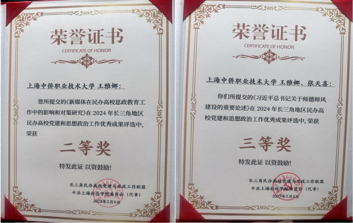 近日,上海中侨职业技术大学马克思主义学院教师在“长三角地区民办高校党建和思想政治工作优秀成果评选”中斩获两项殊荣。其中,王雅娜老师的《新媒体在民办高校思政教育工作中的影响和对策研究》荣获二等奖;王雅娜、张天喜老师的《习近平总书记关于师德师风建设的重要论述》获评三等奖,两项荣誉的取得,充分体现了马克思主义学院在党建与思政教育领域的创新探索和实践成效。