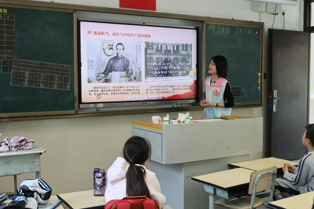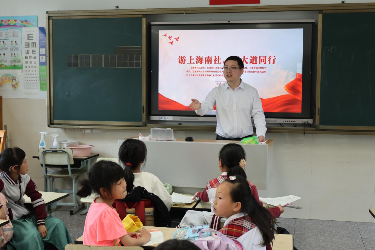 随后,马克思主义学院的余杰老师为学生们系统而全面地梳理了张堰小学周边丰富多彩的红色文化资源,并介绍这些资源不仅承载着深厚的历史底蕴,还蕴含着宝贵的革命精神。在此基础上,积极引导学生按照兴趣与特长进行分组,深入讨论并精心设计出各具特色的红色研学路线,在实践中增强对红色文化的认同。接着,大学生志愿者张诗苑为学生们介绍了南社纪念馆。南社作为中国近代史上规模最大的革命文学社团,大力提倡民族气节,促进了民族意识的觉醒,为马克思主义思想的广泛传播营造了活跃气氛。