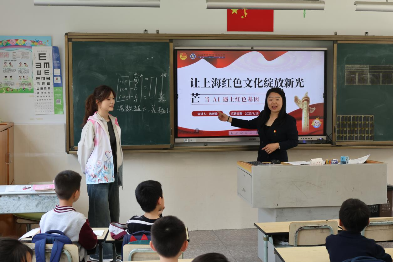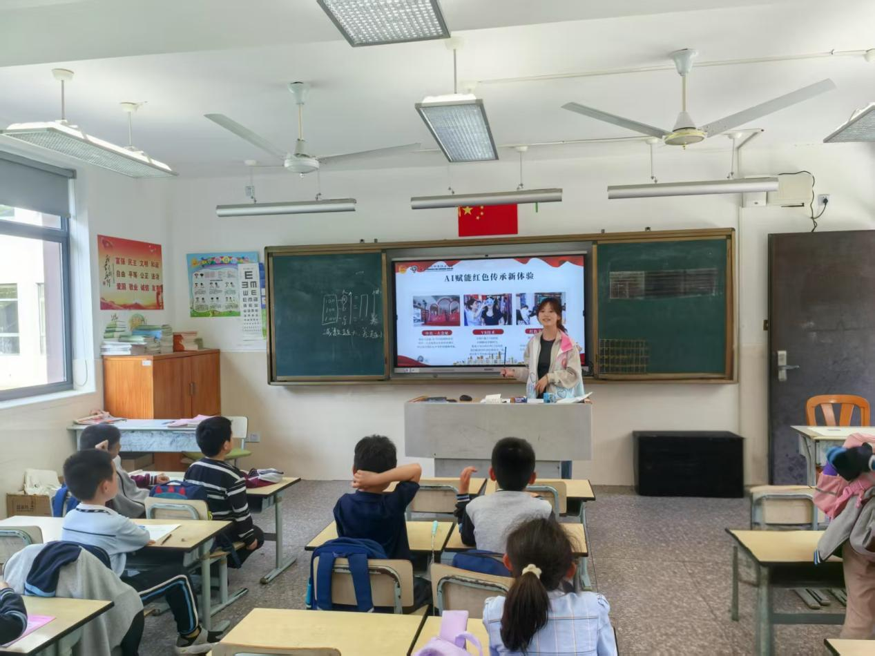 上海中侨职业技术大学马克思主义学院刘咏玲老师首先为小学生们介绍了上海红色文化资源所承载的红色基因以及教育意义,并鼓励孩子们跟着父母多参观一些红色场馆,在行走中增强对红色文化的体验与感悟。紧接着,大学生志愿者孙昕瑜为大家介绍了AI赋能红色传承的新体验,并与小学生们分享了在红色场馆戴上VR眼镜的体验,仿佛瞬间穿越时空。数字化技术让文化遗址和文物跨越时空限制,触手可及。智能讲解系统以生动有趣的方式讲好红色故事。通过这种沉浸式与智能化的体验,我们能深刻感受到中国共产党创建初期面临的艰难险阻,以及先辈们坚定的信念和无畏的勇气。