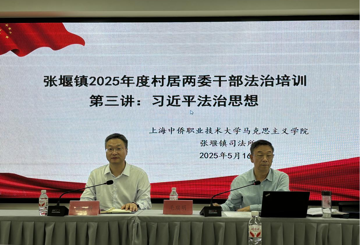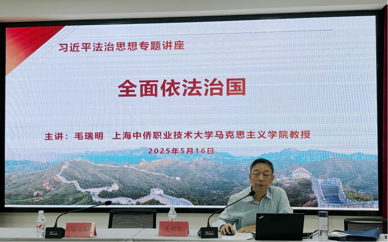 为全面贯彻落实党的二十大和二十届三中全会精神,深入学习贯彻习近平法治思想,牢固树立法治理念、强化法治思维,着力提升基层依法治理水平,5月16日下午,上海中侨职业技术大学马克思主义学院毛瑞明教授赴张堰镇司法所开展习近平法治思想主题培训活动,活动由张堰镇司法所所长陈跃平主持。