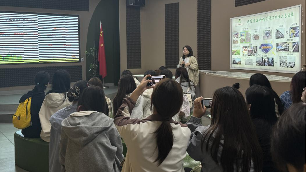 活动以“理论讲解—实地参观—实践体验”展开。在科普展示厅,基地技术骨干通过展板、模型与PPT,详解双孢蘑菇的营养价值——富含优质蛋白、维生素且低脂,更揭秘产业创新:引进荷兰“三次发酵法”与智能控制系统,使蘑菇年种植茬数从2茬增至11茬,单产提升30倍;与市农科院合作培育“K6”新品种,打破国外种源垄断,年省菌种成本超200万元;创新“稻麦秸秆-蘑菇-有机肥”模式,年消纳6万吨秸秆、4万吨畜禽粪便,转化为10万吨有机肥还田,实现生态循环。学生们踊跃提问,现场互动热烈。