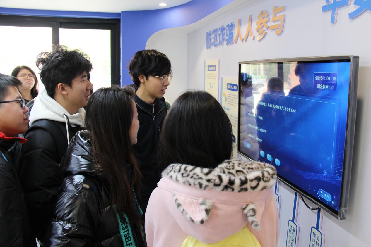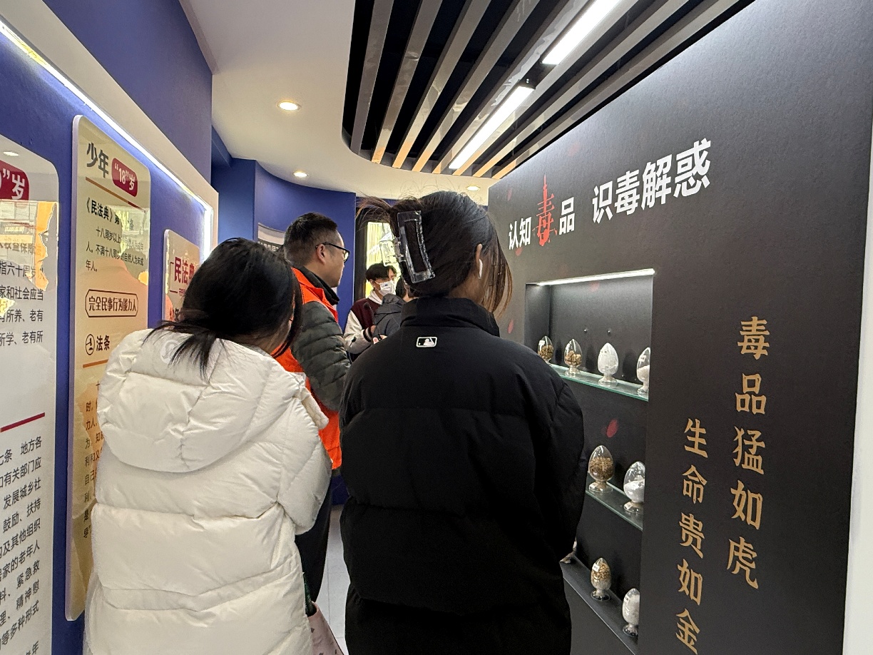 在讲解员的带领下,研学队伍首先走进了张堰镇平安建设实践站。该站以普及平安防护知识,夯实基层治理阵地为宗旨,设有禁毒、防诈骗、反邪教、反恐怖主义等法治互动学习屏,实时更新电信网络诈骗手法拆解、新型毒品伪装识别等实用内容。经老师介绍后,同学们饶有兴趣地使用互动屏学习,现场不时传来阵阵恍然大悟的感叹。通过沉浸式体验,大家对平安中国、法治中国建设有了更直观和深刻的认识。
