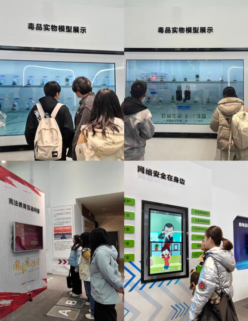 宣誓仪式结束后,师生们开启了内容丰富、形式多样的法治与安全实践体验之旅。在毒品预防教育展区,工作人员围绕宪法中“国家尊重和保障人权”的核心精神,结合真实案例,详细讲解了常见毒品的种类、隐蔽性特征、严重危害及相关法律规定。展区内陈列的各类毒品实物模型,让原本抽象的禁毒知识变得直观可感,也让师生们深刻认识到新型毒品的伪装性与危害性。在网络安全学习板块,师生们通过图文展板、互动演示系统学习了家庭网络保护、儿童网络安全、工作场所网络防护、公共Wi-Fi安全以及数据安全、人工智能安全等知识。“原来电信诈骗的套路这么多,以后不仅要自己提高警惕,还要提醒家人保护好个人信息!”一名学生在体验后认真说道。通过毒品预防与网络安全的双重学习,师生们既筑牢了“珍爱生命、远离毒品”的思想防线,也提升了应对网络风险、维护自身合法权益的法治意识。