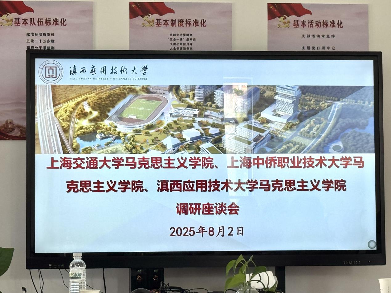 为深入贯彻落实习近平总书记关于思政课建设的重要指示精神,深化沪滇教育协作,2025年8月2日,上海交通大学、上海中侨职业技术大学与滇西应用技术大学马克思主义学院共同举办调研座谈会。活动以习近平新时代中国特色社会主义思想融入思政课教学为核心,探索职教特色思政育人路径,同时结合本科评估工作要求,推动校际资源共享与经验互鉴。上海交通大学马克思主义学院教师代表、上海中侨职业技术大学马克思主义学院党支部书记封晓莉、教学副院长郭晓平以及学院教师代表,滇西应用技术大学马克思主义学院院长王国强以及学院教师代表出席。