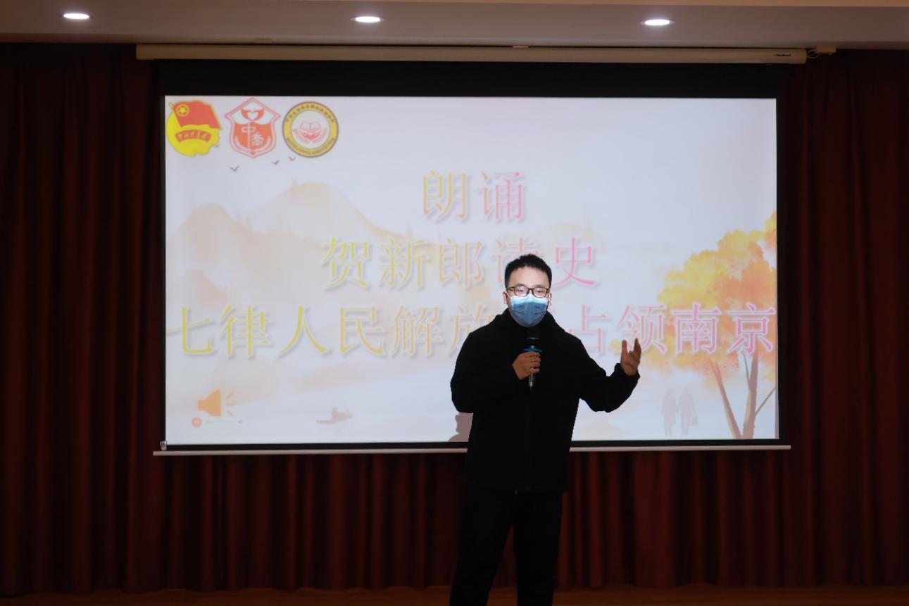 紧接着由学生们自编自演的精彩文艺节目将现场气氛推向高潮。慷慨激昂的诗词朗诵《贺新郎·读史》、《七律·人民解放军占领南京》展现了澎湃的家国情怀;