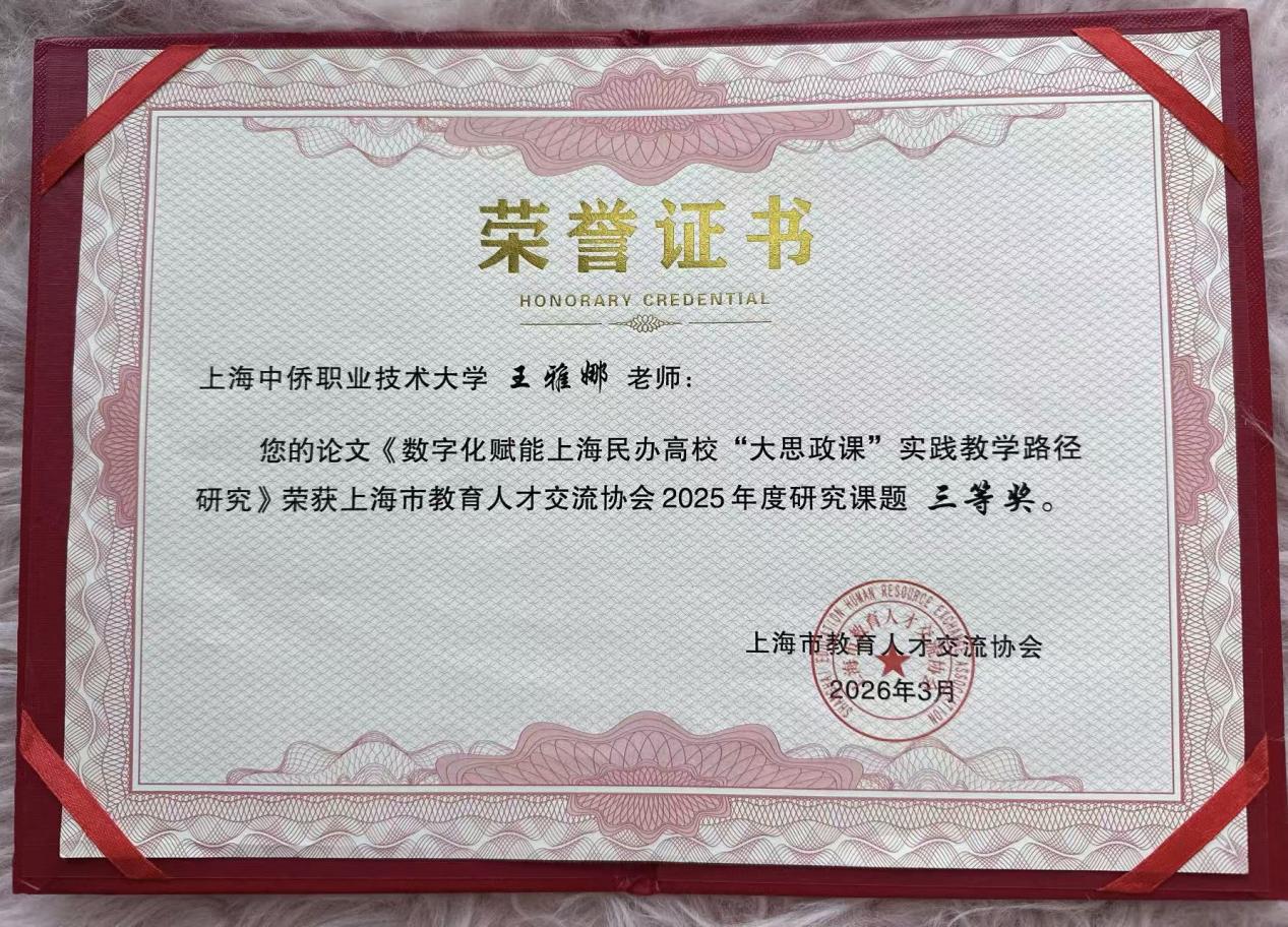 近日,上海市教育人才交流协会举办首届“智能时代教育人才学术年会”,对2025年度研究课题进行表彰,中侨大学马克思主义学院教师王雅娜的论文《数字化赋能上海民办高校“大思政课”实践教学路径研究》荣获三等奖。