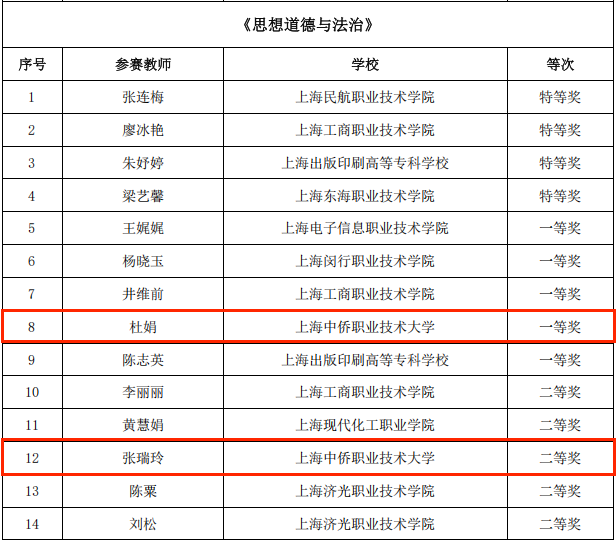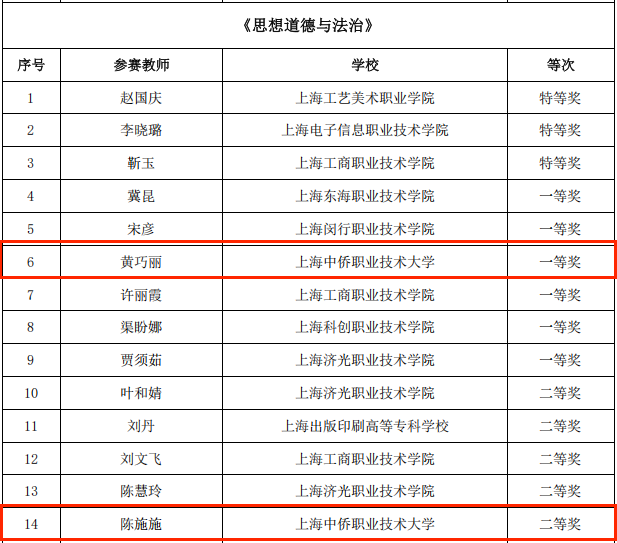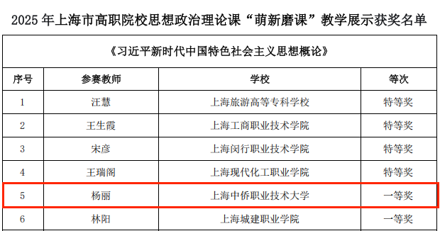近日,由上海高职高专思想政治理论课建设联盟、上海高校思政课教指委高职高专分委联合组织的2025年上海市高职院校思想政治理论课“萌新磨课、骨干练兵”教学展示获奖结果正式公布。上海中侨职业技术大学马克思主义学院共荣获 7 项大奖:“萌新磨课”一个特等奖、两个一等奖、二个二等奖;“骨干练兵”一个一等奖、一个二等奖,创下优异成绩,充分彰显了思政课教师的卓越风采。