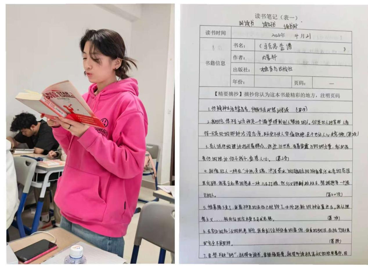恰逢4·23世界读书日,我院紧扣阅读主题,深入学习习近平总书记关于读书学习的重要论述,有序开展多样化读书实践活动。同学们积极响应、潜心品读经典,认真撰写读书笔记,将课堂理论研读、红色经典阅读与敬老院志愿服务实践紧密结合,在墨香中筑牢信仰根基,在实践中体悟读书价值,于点滴积累中收获成长、沉淀自我。